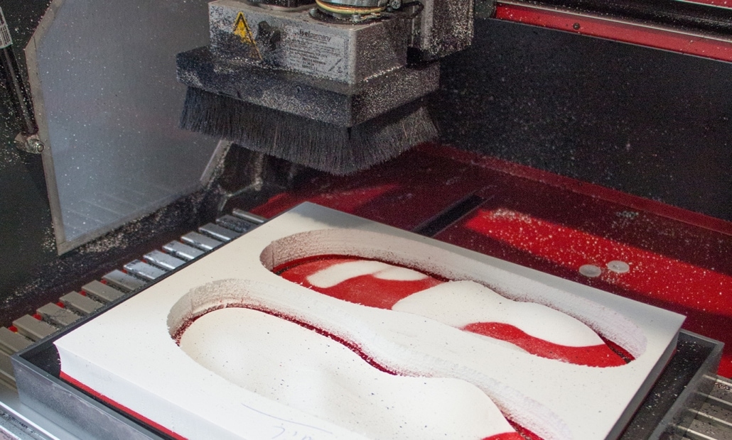 Nach Übertragung der 3D-Daten an die CNC-Fräse werden die maßgeschneiderten Aktivsohlen vor Ort angefertigt.